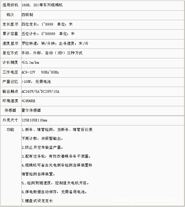 1.斷條、堵管檢測,當(dāng)斷條、堵管后儀表不再計數(shù),并報警輸出。 2.防止開空車偷盜產(chǎn)量。 3.配有過條輪,有效改善棉條條干質(zhì)量。 4.梳棉機可省去光電斷條檢測自停裝置和堵管檢測自停裝置。 5..檢測刺輥速度,控制道夫電機開啟。 6.停電數(shù)據(jù)自動保存,無需備用電池。 7.鍵盤式設(shè)定定長 |